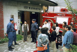 毎年10月に防災訓練を行ないます。 始めに舎監の先生のご指導のもと、消火器の位置を確認するのが恒例になっています。 それから消防署の方が来て下さり、通報訓練、避難はしごを使っての避難訓練、水消火器による消火訓練をします。その後は非常ベル、火災報知機の使い方の訓練をして終ります。 この日は授業はなく、午前で防災訓練は終わるので、昼食後にお誕生会をしました。