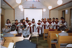 公式の学校行事ではありませんが、近年毎年、学校の近くの特養老人ホーム「平成園」でクリスマス会をさせていただいています。普段は月一回、草むしりのボランティアをしています。クリスマス会は歌が中心で、クリスマスキャロルや賛美歌のほかに、「青い目の人形」「お正月」「二人は若い」など童謡などもお年寄りの方たちと一緒に歌い、楽しいひと時でした。喜んでいただくと同時に、その笑顔から、こちらも豊かな気持ちをいただいて、喜びを与えられて帰ってきました。
