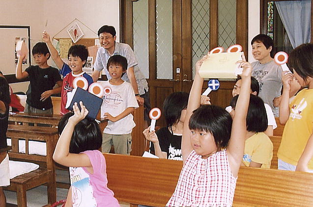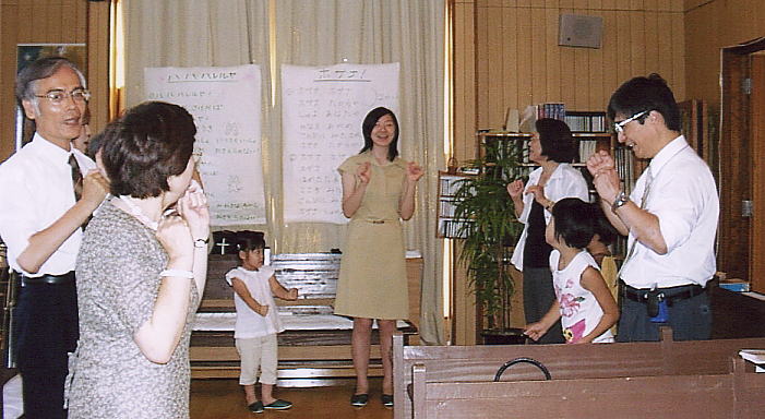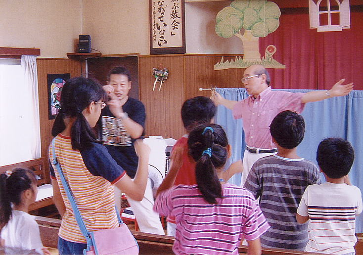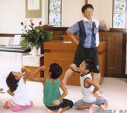8/7(日) 6:30amいつも通り全員で早天、朝食後、CSの準備。 9:00am教会学校。子供は川上家の3人と女の子1人。森田姉がよく準備されたメッセージをとりつぐ。分級は中込兄。(写真) 10:15am 一般礼拝。説教は島先生。学生は賛美奉献と、証し(小形姉)、奏楽の奉仕をした。シオンちゃんの献児式も行われ、大変恵まれた礼拝となった。礼拝後の愛餐会では全員が自己紹介をし、最近受洗した方、長い信仰暦の方、韓国の方、色々な方がこられていることを知ることが出来た。 1:30pm 市内教会合同の子供会のお手伝い。酒田でもやったミュージカル「迷子のザアカイ」を上演。ゲームをたくさん森田姉が用意して、子供たちを喜ばせた。子供12人。ビデオ上映あり、カキ氷あり、お菓子あり、メッセージ(中村師)あり、バルーンあり、もりだくさんであっという間の二時間だった。 子供会のあと夕食を外で全員で食べて、島先生と、深谷は再び仙台へ。他の学生は一泊してから翌日学校に帰校。新庄では学生が食事を当番で用意する話だったが、実際は満希子師と栗原姉が大半を手伝ってくださり、助けていただいた。